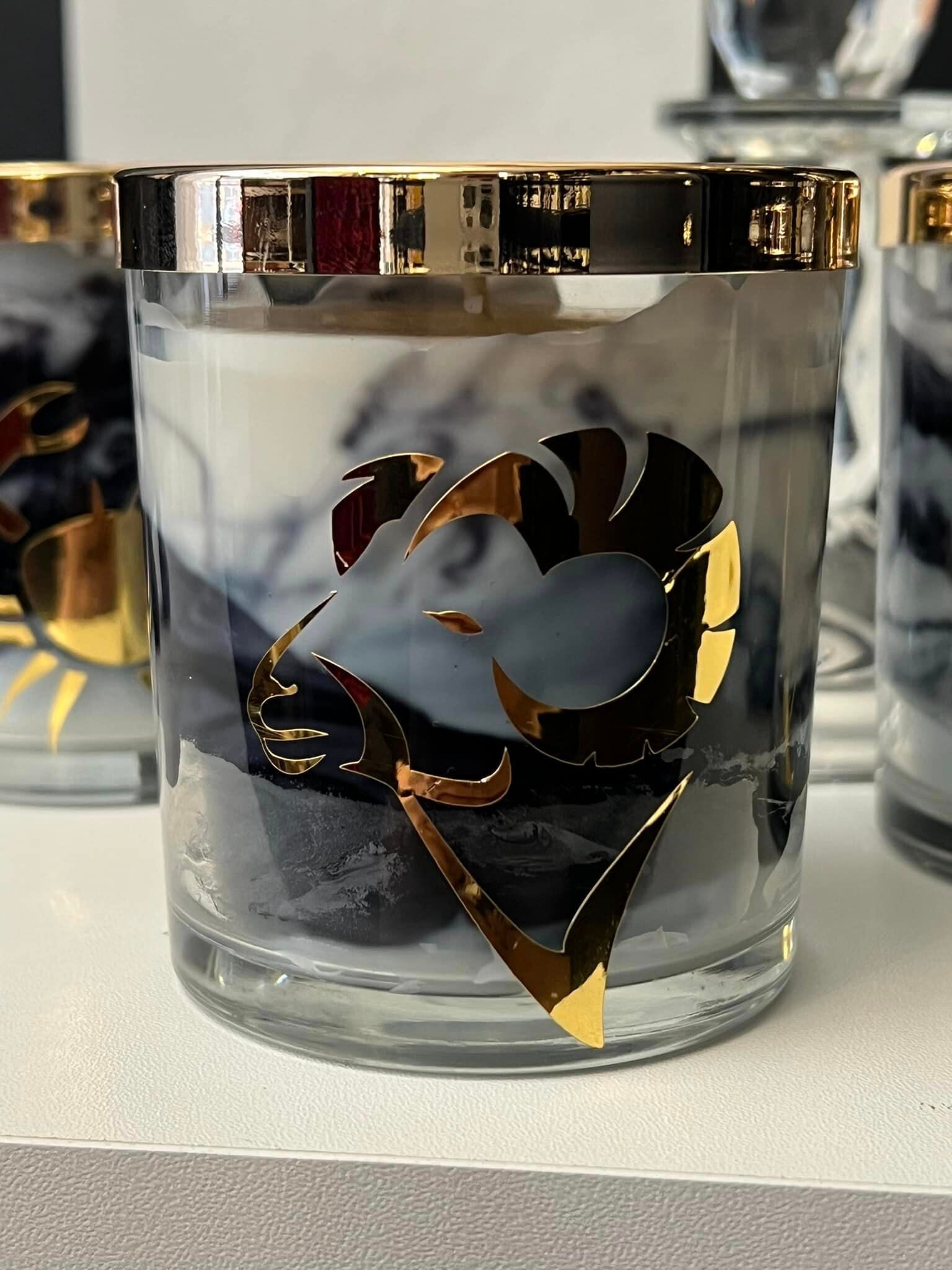 Bougie au doux parfum ambré, avec un effet de marbrage noir et blanc dans un contenant en verre transparent de 160ml, avec le symbole et le couvercle en doré.